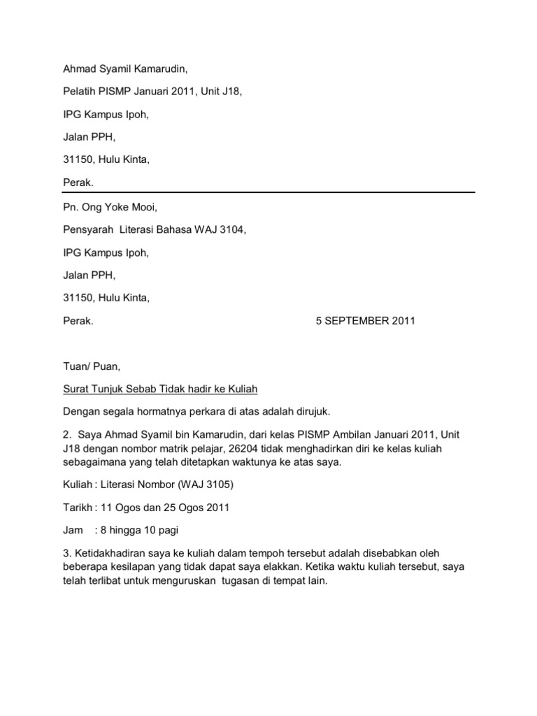 4 adalah lebih baik dengan. Surat ketidakhadiran ke kuliah translate. Contoh surat tunjuk sebab tidak hadir ke kuliah kita tidak mahu setiap kali ketidak hadiran anak ke sekolah dikira sebagai ponteng kerana ianya memberi efek kepada buku rekod.
